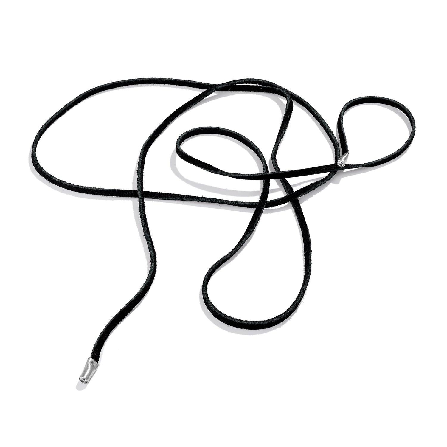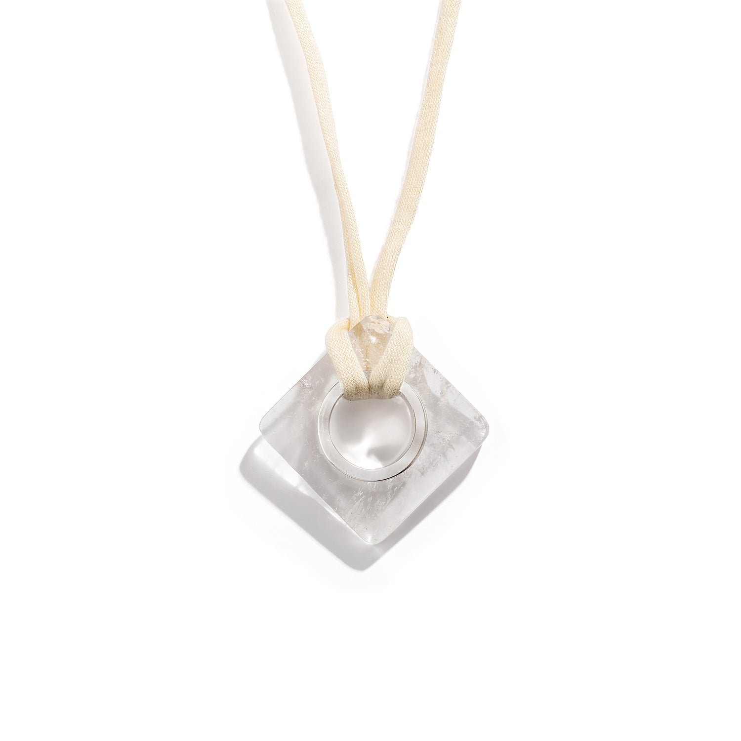 This rock crystal pendant is a revival of a design Renato created in the 1970s with platinum detail. Hanging from either a white cord or black suede cord with platinum ends set with diamonds, this can be tied according to the length the wearer desires.