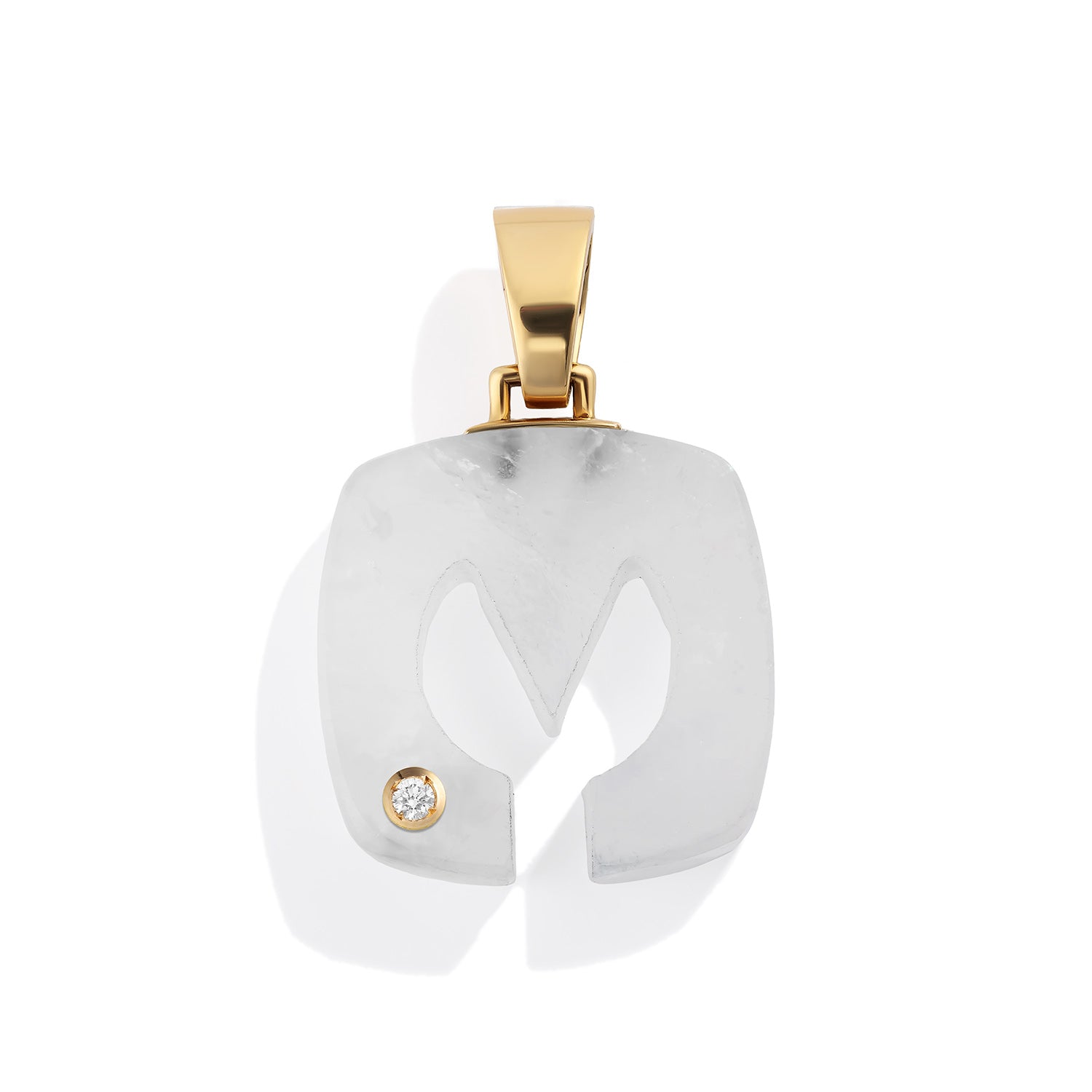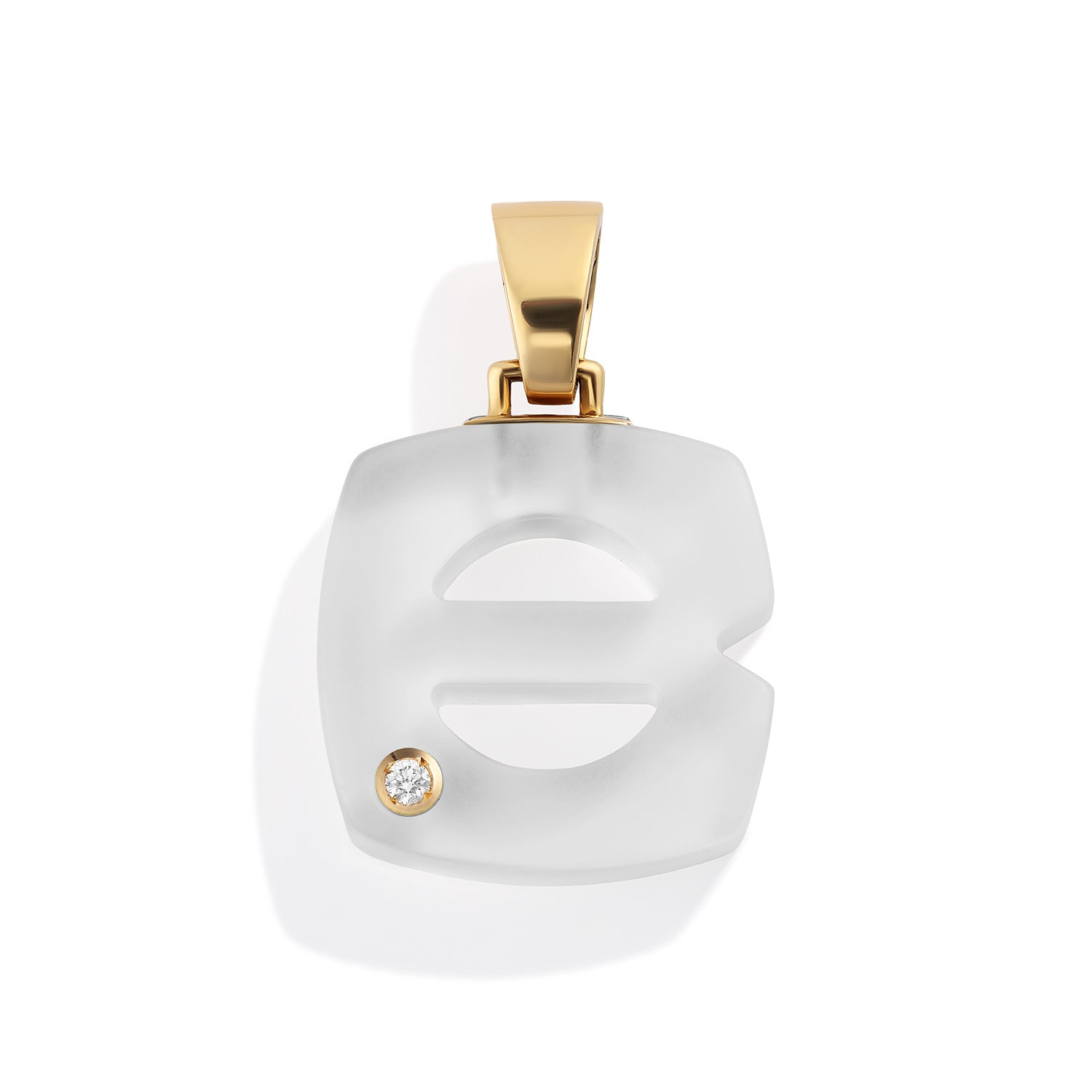 Pendente "A" in oro giallo in stile scatolato con retro perforato in un motivo di ispirazione retrò. Ognuno di questi è dotato di una balestra superiore che funge da fermaglio nel caso in cui si abbia qualcosa a cui si voglia agganciarlo. Renato ha progettato questo stile di carattere originale influenzato dai motivi degli anni '70 e dal design grafico italiano.