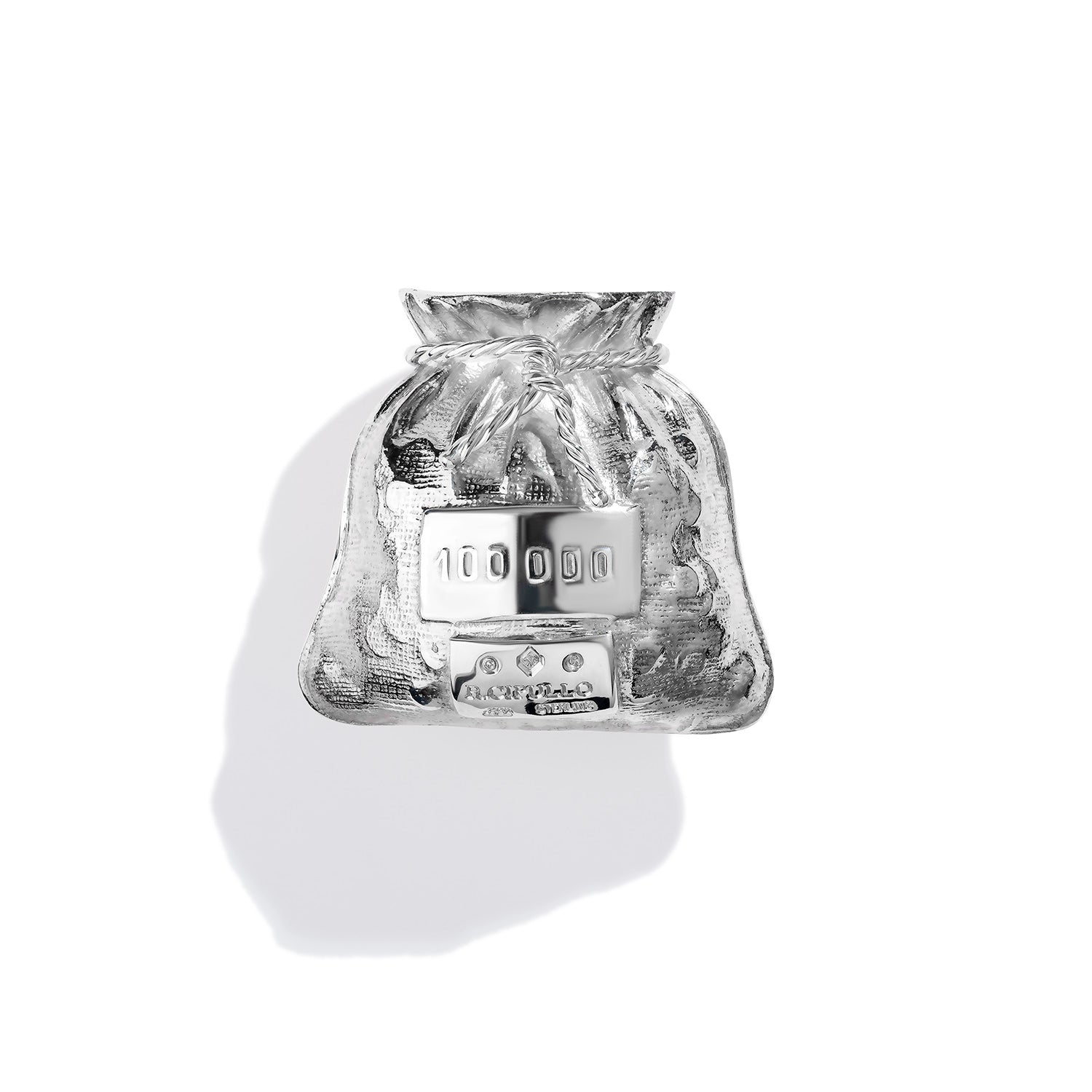 This sterling silver object is a money bag with rope detailing and a plaque that reads "100,000."