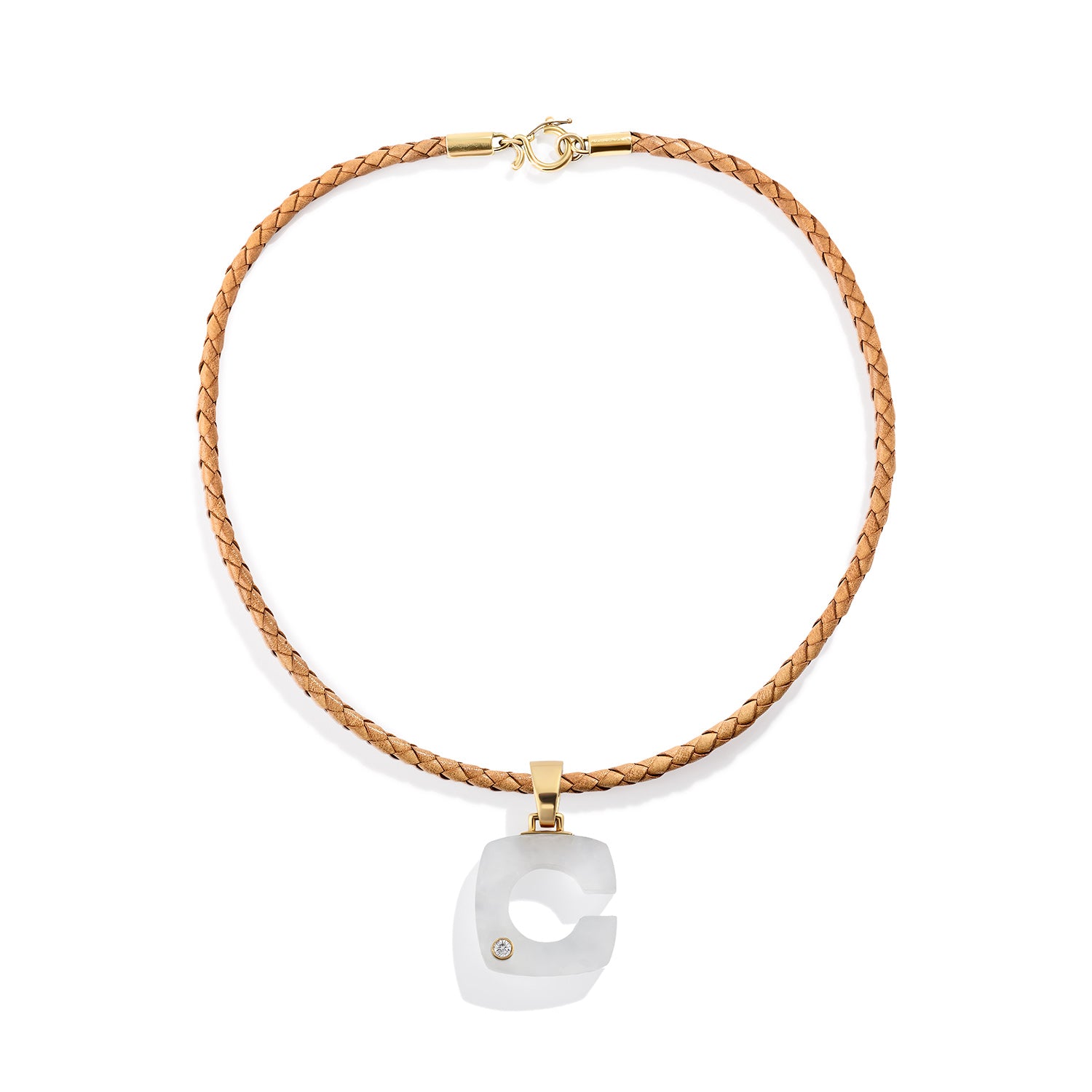 Frosted rock crystal letter pendant with a yellow gold bale and yellow gold bezel set round diamond. Renato designed this original font style influenced by 70s motifs and Italian graphic design.